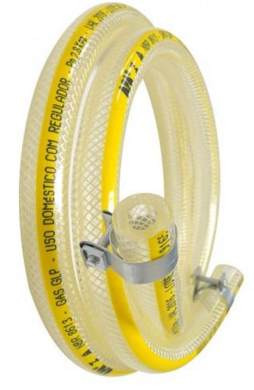 É a mangueira utilizada para gás de fogão doméstico. Ela deve ser feita de material incolor (PVC) e ter uma faixa amarela ao longo do comprimento, contendo a marca de certificação, o prazo de validade, e o nome do fabricante.